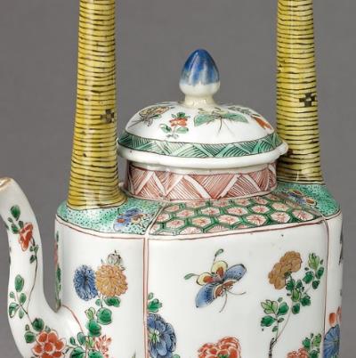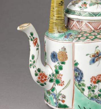 清康熙时期是 “粉彩” 这一彩瓷新品种的初创阶段(学术界多认为粉彩创烧于康熙晚期),虽不如雍正、乾隆粉彩那般精细华丽,却以质朴清新的风格奠定了粉彩瓷的工艺基础。清康熙粉彩花蝶纹提梁壶作为这一时期的代表性器物,既体现了早期粉彩的技术特征,又融入了康熙朝独特的审美取向,是研究清代彩瓷发展与社会文化的重要实物资料。