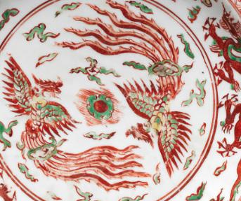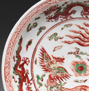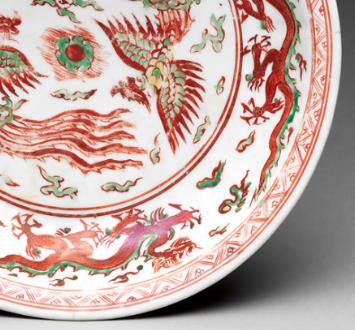 汉代以来,龙逐渐成为帝王的专属图腾,凤则对应皇后,“龙凤同饰” 象征帝后和睦、皇权稳固 —— 嘉靖朝前期曾因 “大礼议” 之争(围绕嘉靖帝生父尊号的政治斗争)引发朝堂动荡,后期皇权高度集中,红绿彩龙凤纹盘上威严的龙凤形象,正是嘉靖帝强化皇权、彰显统治合法性的文化表达。除皇权象征外,龙凤纹还蕴含 “龙凤呈祥” 的吉祥内涵,代表 “国泰民安、天下太平”—— 嘉靖朝虽有倭寇侵扰、边患问题,但社会整体仍相对稳定,龙凤纹盘上的缠枝莲纹(象征 “连绵不绝”)、云纹(象征 “祥瑞”)与龙凤纹结合,进一步强化了 “吉祥安康” 的社会祈愿。