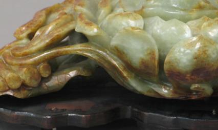 用圆雕工艺,将青玉雕琢成莲藕的形状,整体呈长条形或略带弯曲,以模仿莲藕的自然形态。可能会刻画莲藕的节,节与节之间以凹凸的线条来表现,使造型更加逼真。选用青玉材质,玉质可能细腻温润,色泽均匀,呈现出深浅不一的青绿色调,给人一种古朴典雅的感觉