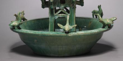 本品规格为直径39厘米,高度54.3厘米。以绿釉陶塑造。主体为水榭建筑,上层有亭阁,攒尖顶,围栏环绕,阁中及栏侧塑有人物,似呈现活动场景。下层为水池,池沿塑有禽鸟、小鹿等动物。整体造型精巧,通过建筑、人物、动物组合,生动再现东汉庭院水榭景观,绿釉增添古朴韵味,是研究东汉建筑、生活场景的珍贵实物,反映当时工艺水平与社会风貌 。