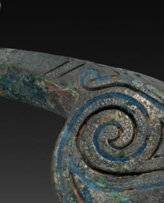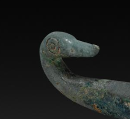 本品规格为6.2 厘米。整体为鸟形(或鹅形 ),钩首如鸟喙(尖细上扬 ),钩身似鸟身(扁圆宽大 ),线条流畅自然,将实用带钩与鸟形仿生结合,体现东周 “器型尚巧” 的审美 —— 既满足束带功能,又具艺术观赏性。铜胎表面以错彩(或错金银、嵌松石 )技法,饰以卷云纹(或蟠螭纹 ),蓝、红彩料(或金属丝、宝石 )嵌入铜槽,历经千年仍显斑驳华丽,彰显东周 “错彩镂金” 的工艺巅峰。