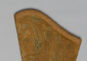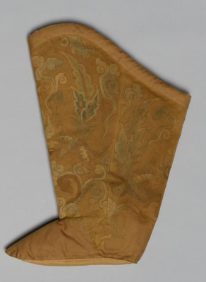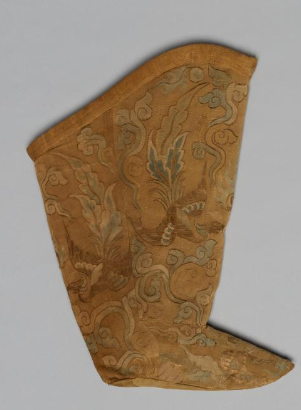 本品规格为47.5 x 30.8 厘米。以绫为质,轻薄柔软,色泽古朴(呈棕黄色 ),体现辽代丝织工艺对材质的精细选用,适配游牧民族对服饰轻便、实用的需求。呈靴套形态,贴合靴型,开口便于套穿,体现辽代服饰 “因俗而制” 的特点 —— 适配契丹族传统靴履,兼顾游牧生活中骑马、行走的实用性,又通过精美纹饰彰显身份与审美。