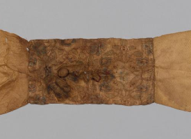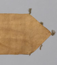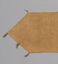 本品规格为24.3 x 197.5 厘米。以锦为质,主体为浅棕素锦,中间拼接深色花纹锦(图案难全辨,似有几何或植物纹 ),采用拼接工艺,体现辽代 “以锦为贵、拼接成饰” 的纺织审美,虽历经岁月,仍可见锦料的细密质感。呈长条形,两端为尖形(或为系缚设计 ),中间收窄并拼接花纹锦,边缘有细绳残留(或为固定、悬挂之用 ),符合辽代 “带饰” 的实用形制 —— 适配服饰束腰、配饰装饰需求。