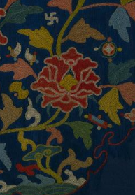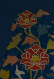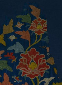 本品规格为63.8 x 60 厘米。呈云肩造型(传统服饰肩部装饰,形似云朵,寓意吉祥 ),以深蓝色为底,轮廓贴合肩部,层次丰富,是明代女性服饰中彰显身份与美的重要配饰。主体为牡丹(象征富贵繁荣 ),搭配枝叶、云纹,传递 “花开富贵”“吉祥如意” 的美好愿景,符合明代 “图必有意” 的装饰传统,是身份、审美与文化寓意的融合。运用彩绣技法,以红、黄、绿、蓝等多色丝线,通过平绣、戗针绣等针法,细腻呈现牡丹花卉(花瓣饱满、枝叶舒展 )、云纹(形态婉转,烘托氛围 );色彩对比鲜明,针脚细密,体现明代 “彩绣” 华贵精细的工艺水准。