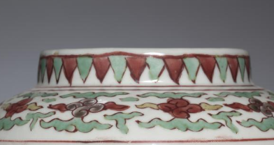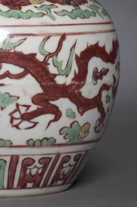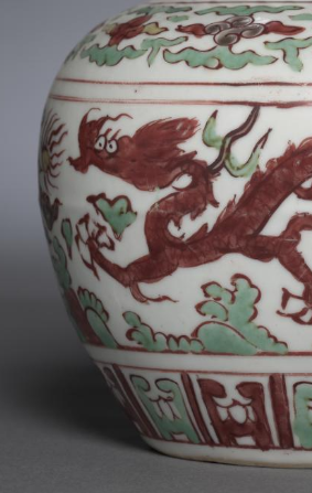 本品规格为直径14.7厘米,高度12.9厘米。造型敦实饱满,短颈圆肩,腹部丰腴,下腹内收,底部承以圈足 。罐身以白釉为地,其上绘以红绿彩纹饰。主体纹饰为栩栩如生的龙纹, 龙身以红彩勾勒渲染,身形矫健,张牙舞爪,龙须飞扬,双目圆睁,尽显威严霸气;龙身周围点缀着绿彩绘制的云朵纹饰,与红彩龙纹相互映衬,色彩对比鲜明。