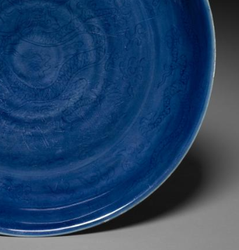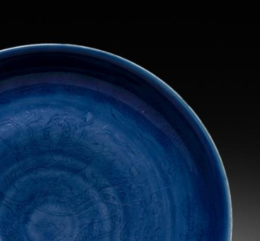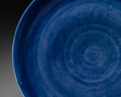 本品直径28.4 厘米。造型规整,呈敞口、浅弧腹、圈足之态 。通体施霁蓝釉,釉色浓郁深沉,如宝石般幽亮润泽,尽显明代霁蓝釉的经典特质。盘中以刻花工艺隐现龙纹,线条流畅细腻,龙形矫健威严,在蓝釉映衬下,虽不张扬却自带皇家气韵 。刻花与霁蓝釉的结合,既展现了明代制瓷的高超技艺 —— 蓝釉烧制的精准把控、刻花工艺的细致入微,又因龙纹题材,凸显其可能为宫廷用器,承载着明代皇权象征与审美意趣,是研究明代陶瓷艺术、宫廷文化的重要实物 。