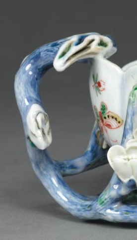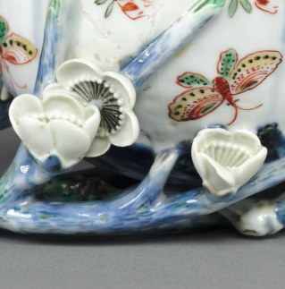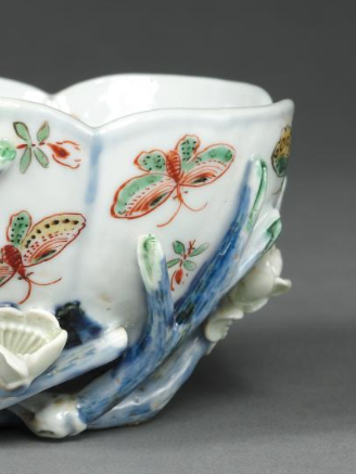 本品规格为6.7 x 12.6 厘米。造型独特,呈花口式,一侧以蓝彩堆塑成枝干状把手,底部亦有蓝彩堆塑的枝干、花朵,立体生动。器身施白釉为地,以五彩绘蝴蝶、花卉纹饰,色彩丰富艳丽,蝴蝶形态各异,花卉点缀其间,兼具堆塑工艺的立体美感与五彩绘画的平面装饰,展现明代制瓷匠人的精湛技艺,是实用与艺术结合的文房佳器,反映当时审美与工艺水准 。