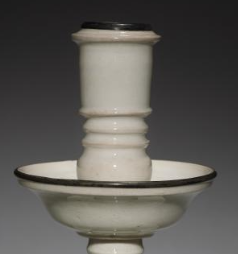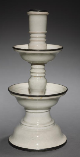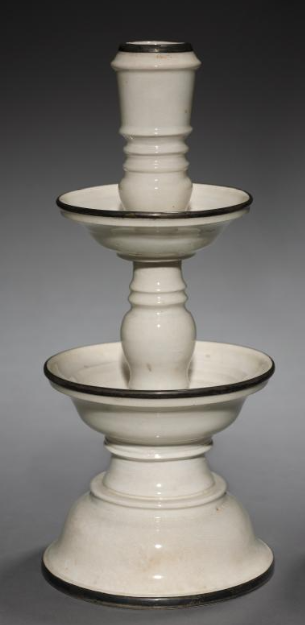 本品规格为32.4厘米。以白瓷为质,胎质细腻。造型为双层台座式,由上至下,烛柱纤细,连缀两层圆盘,底层为宽硕台基,各层边缘饰黑釉线,简约中显精致。整体洁白素雅,制式规整。
