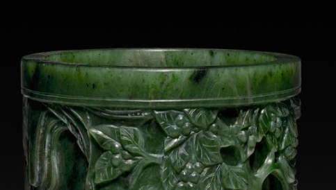 本品规格为直径8.4厘米,高度12.5厘米。以碧玉为材,色泽浓郁沉绿(局部墨点自然分布 ),质地温润细腻,符合清代 “碧玉尚厚” 的审美 —— 深色玉料更显雕刻层次。规整圆筒造型,口沿与底足线条平直,体现清代 “文房器尚正” 的实用逻辑(便于插笔、稳定放置 )。