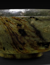 本品规格为直径19.6厘米,高度7.7厘米。以碧玉为材,质地温润。碗呈敞口、弧壁、圈足造型,简洁规整。左碗玉色丰富,有绿、褐等色交织,纹理如自然晕染;右碗以青绿为主,散布黑色斑点,具独特天然肌理。整体古朴雅致,尽显清代玉器工艺对材质天然美的呈现,成对保存更显珍贵,是兼具实用与艺术价值的文房或宴饮器具,承载清代玉器审美与文化 。