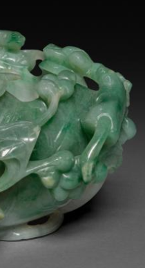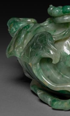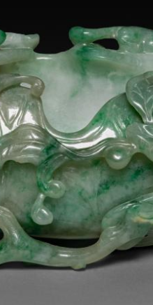 本品规格为61 x 10 厘米。以翡翠为材,质地温润,绿白交织的色泽(飘绿灵动 )天然成趣,符合清代 “翡翠尚翠” 的审美 —— 翠色为贵,自然纹理被巧妙运用。整体仿瓜果枝叶形态(或为葫芦、缠枝纹 ),笔洗主体如瓜果轮廓,枝叶、藤蔓蜿蜒环绕,灵动自然,体现清代 “玉雕尚仿” 的工艺特色 —— 以自然物象为原型,追求 “虽由人作,宛自天开”。