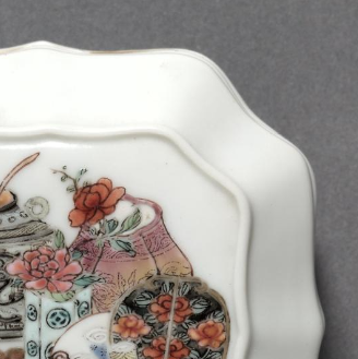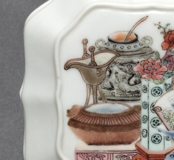 本品规格为4 x 7.5 厘米。盘呈花口形,白釉纯净。盘面以粉彩绘博古纹,集鼎、壶、瓶、盆等古器物与花卉于一体,色彩丰富,细节精致,勾勒出古雅的文玩场景。整体工艺细腻,体现清代文人对博古清供的审美,是兼具实用与艺术价值的粉彩瓷盘珍品 。