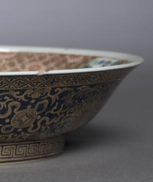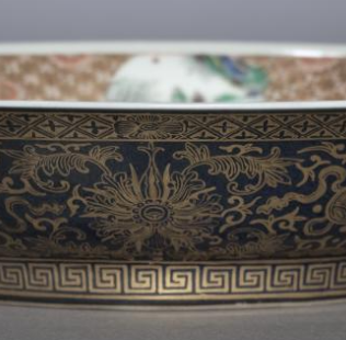 本品规格为4.6 x 19.8 厘米。器型规整,敞口深腹,圈足。以蓝色为地,绘金彩缠枝花卉纹,线条流畅,花卉形态优美,辅以几何纹装饰圈足,内壁有彩釉开光图案。蓝金配色华贵,工艺精湛,尽显清代官窑瓷器的富丽与精致,是研究清代陶瓷装饰艺术的重要实物 。
