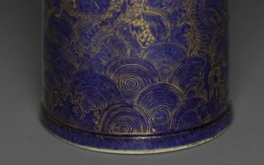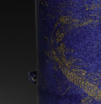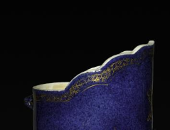 本品规格为直径14.7厘米,高度41.6厘米,带出水口的直径20.6厘米。以洒蓝釉为地,釉面呈繁星洒落般的独特质感。器型仿竹节,一侧设弯曲流,口沿呈花瓣状,饰描金缠枝纹。主体绘描金云龙,龙游于海浪间,金彩璀璨,与蓝釉相衬,尽显华贵。多穆壶源自藏地,此器融合中原制瓷工艺与民族文化,是清代瓷器中兼具艺术与文化交流价值的珍品 。