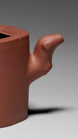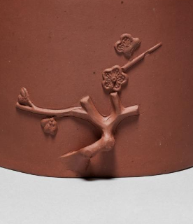 本品直径为18厘米,高度10厘米。以直筒为基础形态,轮廓简洁利落,口部呈不规则多边形,打破规整感,增添自然意趣;壶柄、壶流塑成梅枝形态,弯曲自然,与直筒壶身形成刚柔对比,整体造型仿生且别致。壶身贴塑梅枝、梅花,枝干曲折、花朵绽露,细节生动,将梅花傲雪之姿融入壶体,兼具写实与艺术加工,契合清代紫砂 “仿生器” 的审美风尚,借梅之高洁寓意,赋予器物文化内涵。