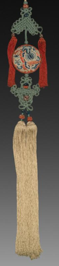 为精致配饰,它能与清代传统服饰,如朝服、官服、华丽的便服等搭配。挂饰上精美的中国结、嵌宝圆形牌和流苏,能为服饰增添华丽感与层次感, 提升穿着者整体气质,符合清代对服饰配饰讲究精致、彰显身份的审美观念。