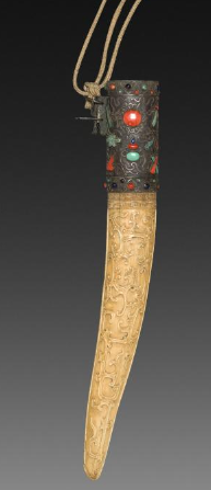 以象牙为材,质地温润,鞘身满布浮雕(或为螭龙、缠枝纹 ),线条细密流畅,经岁月沉淀呈浅黄包浆,尽显清代 “牙雕尚精” 的工艺追求。鞘口金属(银或铜 )部位,镶嵌多色宝石(红、绿等 ),宝石错落排列,与金属底托、象牙鞘形成 “金 - 宝 - 牙” 奢华对比,契合清代 “嵌宝显尊” 的审美。