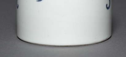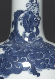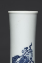 本品规格为直径10.5厘米,高度18.5厘米。以白瓷为胎,施白釉,釉色纯净。器型如摇铃,小口、长颈、垂腹。颈部至腹部绘青花海水异兽纹,海水波涛翻涌,异兽灵动神秘,青花发色浓艳,纹饰细腻。整体造型端庄,青花与白釉相衬,尽显清代官窑青花瓷器的典雅与工艺精湛,是研究清代瓷器审美与文化的重要实物 。