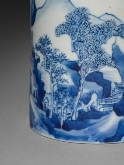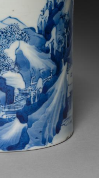 本品规格为直径12.3厘米,高度15.2厘米。呈直筒形,胎质细腻,白釉温润。外壁以青花绘山水图景,山峦起伏,树木葱郁,屋舍隐现于林间,构图层次分明。青花发色浓淡相宜,笔触细腻,将山水意境生动呈现,兼具实用与艺术价值,是清代文房雅器,尽显文人审美与制瓷工艺之精 。