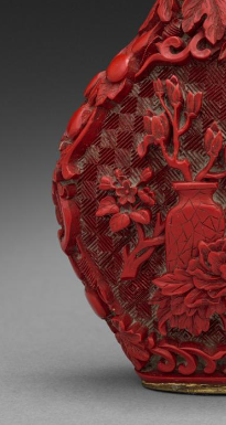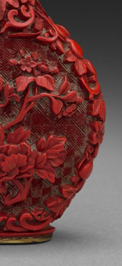 本品规格为7厘米。壶身主纹为 “瓶花图”(花瓶、牡丹、枝叶 ),雕刻细腻(花瓣纹理、叶片脉络清晰 ),运用 “分层剔刻” 技法,营造 “花繁叶茂” 的立体效果,体现清代 “雕漆尚工” 的审美 —— 追求写实与装饰性统一。扁圆壶体,配鎏金錾花盖,线条圆润,符合清代鼻烟壶 “小巧把玩” 的实用逻辑 —— 贴合掌心,方便携带赏玩。