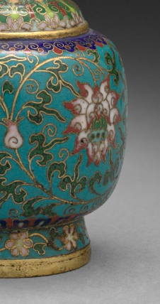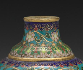 本品规格为7 厘米。 壶身主体装饰缠枝莲纹, 莲花花瓣细腻, 以粉色、 白色等珐琅釉表现, 花蕊、 枝叶则用绿色珐琅搭配金色铜丝勾勒, 呈现出 “花蔓缠绕、 连绵不断” 的视觉效果, 寓意吉祥、 富贵, 体现清代工艺对传统吉祥纹饰的运用。颈部、 足部辅以小花纹(如小朵花、 卷草纹 ), 与主体缠枝莲纹相呼应, 色彩上以蓝地为底色, 搭配金、 红、 绿、 白等多种颜色, 对比鲜明又和谐统一, 遵循清代 “纹饰丰富、 色彩华丽” 的装饰风格, 让整个鼻烟壶视觉层次饱满。