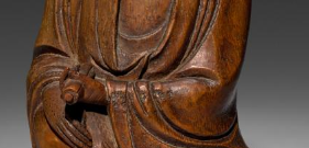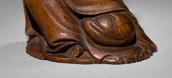 本品规格为15.7 x 9 厘米。以竹材精雕而成。仕女呈坐姿,发髻高挽,面容安详,衣袍线条流畅自然,褶皱因竹雕工艺生动呈现,尽显古朴典雅。整体造型端庄,雕刻细腻,通过对人物神态、服饰的刻画,展现清代竹雕艺术的精湛技艺,传递出独特的古典美感与文化韵味,是研究清代雕刻艺术和审美风尚的实物范例 。