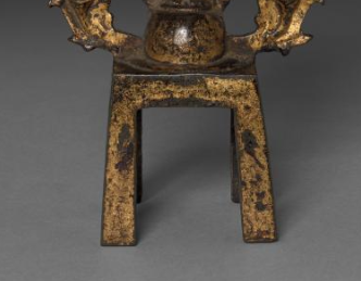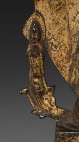 呈 “一主二胁侍” 三尊式,主尊立像居中(结跏趺坐或直立 ,因锈蚀难全辨 ),两侧胁侍像对称(或为菩萨、弟子 ),背屏作火焰纹舟形(尖顶,满布火焰、卷草纹 ),底座为四足方座,整体 “中轴对称”,符合隋代佛教造像 “庄严规整” 的布局逻辑。主尊头戴宝冠(或肉髻 ),身披袈裟(衣纹垂坠自然 ),双手施印(或说法、禅定印 );胁侍像身姿纤秀,背光火焰纹灵动(似飘带卷曲 ),整体风格承北魏 “秀骨清像” 余韵,又启唐代 “丰满圆润” 先声,体现隋代佛教造像 “过渡融合” 的艺术特征。