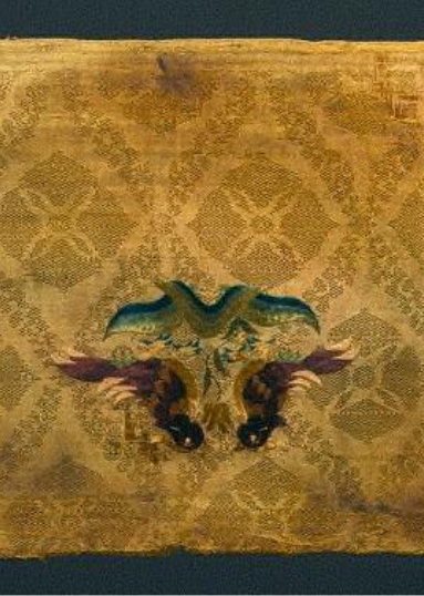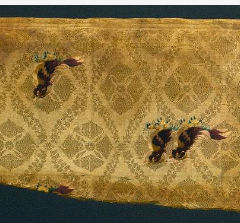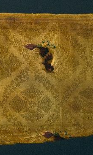 本品规格为157.5 x 25.7 厘米。布局有序,菱格纹重复排列构建秩序感,飞禽纹(或为瑞鸟 )穿插其间,动静相宜,符合唐代染织品 “以纹表意” 的风格 —— 菱格象征稳定,飞禽寓意自由、祥瑞,传递 “安居祥瑞” 的美好愿景。呈长带状,质地轻薄(可推测为丝织物 ),适配唐代服饰、器物的装饰需求(如衣缘、带饰 ),体现唐代染织品 “因用而制” 的设计逻辑。