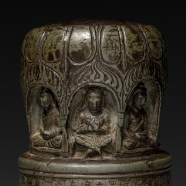 本品规格为16.9 厘米。由上至下分 “幢顶、幢身、幢座”,幢顶为莲瓣 + 佛龛(浮雕三佛,结跏趺坐 ),幢身为经文铭刻(字体古朴,内容或为佛经 ),幢座为护法造像(浮雕人物,或为天王、力士 ),符合北朝 “经幢尚层” 的造型逻辑 —— 分层承载 “佛、法、僧” 三宝寓意。幢顶三佛,衣纹简洁(褒衣博带或通肩袈裟 ),面容清瘦(北朝 “秀骨清像” 风格 ),手势各异(说法、禅定等 ),体现北朝佛教造像 “尚简崇神” 的审美 —— 宗教庄严感大于写实。
