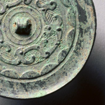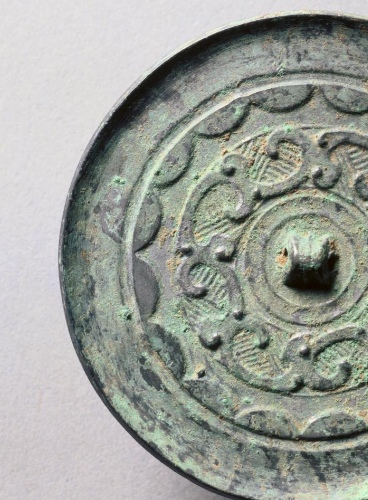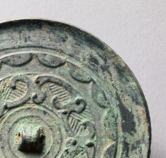 本品规格为直径7.7厘米,厚度0.4厘米。圆形,中央设弦纹钮(便于穿绳悬挂、手持),外区环绕连弧纹(多为内向连弧,装饰边缘),遵循西汉铜镜 “圆钮、连弧饰边” 的经典设计,实用与审美结合。以凤鸟纹为主体,线条简洁流畅,呈对称分布于镜背,凤鸟造型抽象灵动(体现西汉纹饰 “简约大气” 的风格);连弧纹作辅助装饰,象征圆满、祥瑞,反映当时对 “天圆” 观念与神灵(凤鸟为神鸟)的崇拜。