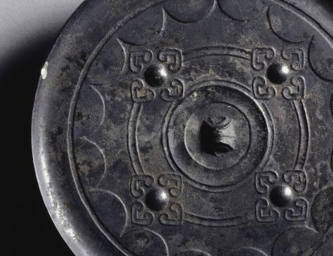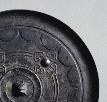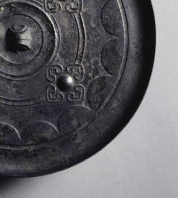 本品规格为直径14厘米,厚度0.6厘米。圆形,中央设弦纹钮(便于穿绳悬挂、手持),外区环绕连弧纹(多为内向连弧,装饰边缘),遵循西汉铜镜 “圆钮、方中带圆” 的经典设计,暗合 “天圆地方” 哲学观,实用与思想融合。四乳钉对称分布,间隔虺纹(线条卷曲、呈几何化兽纹,象征祥瑞),连弧纹作辅助装饰(体现西汉纹饰 “规整大气” 的风格)。四乳象征四季,虺纹寓意守护,连弧代表圆满,反映当时对自然秩序与美好生活的追求。