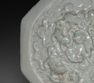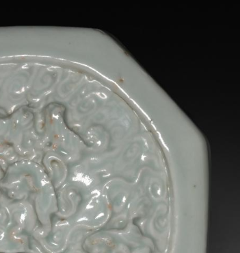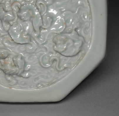 本品规格为6.1 x 9.8 厘米。造型为规整八边形,施青白釉,釉色温润,呈淡雅青白色。盘面以印花工艺呈现立体瑞兽纹,瑞兽姿态生动,周围衬以云纹,纹饰细腻,浮雕效果突出。八棱设计独特,兼具古朴与精巧。 胎质细腻,虽有岁月痕迹,仍可见青白釉的莹润光泽, 是元代青白瓷中工艺与装饰结合的器物,反映当时制瓷对造型、纹饰及立体感的追求 。