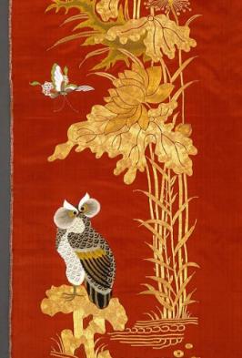 运用广绣典型技法,如 “打枣针” 表现雏菊,“金鱼起鳞片” 刻画禽鸟羽毛,“流星赶月凤尾针” 勾勒凤凰尾羽。猫头鹰的羽毛则可能采用 “施毛针” 分层晕染,以十余色渐变丝线捕捉翎羽的流光;瞳孔以双色捻线绣出夜视精魄,增强立体感。主色调以明黄、浅绿、粉红为主,荷花用胭脂红与白色渐变,莲叶以深绿、浅绿交织,猫头鹰羽毛则以赭石、灰褐、黑色渲染,形成视觉焦点。部分外销品还会加入金线勾勒,营造华丽质感。