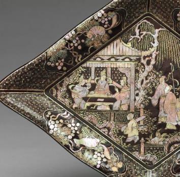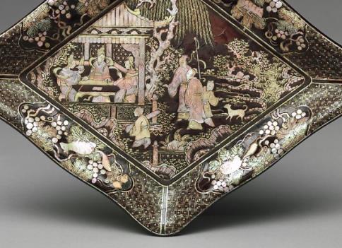 螺钿工艺起源早,西周墓葬中就有镶嵌蚌泡的漆器。宋代薄螺钿工艺开始出现并逐渐占据主流。元明时期,螺钿工艺使用的贝壳品种更丰富,加工更精细,还发展出加彩漆、描金等辅助手法,至 17 世纪达到高峰,江西吉安等成为主要产地,涌现出江千里等著名匠人,明末黑漆嵌螺钿游园赏乐图菱形盘正是这一工艺发展高峰期的产物。
