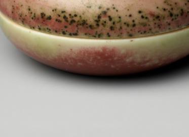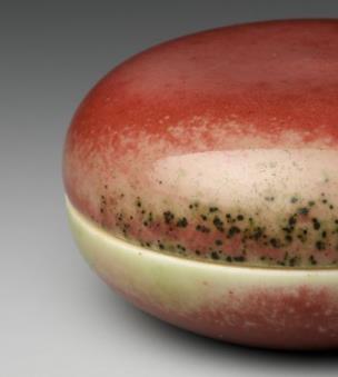 通常为扁圆形,造型小巧玲珑,直径一般在 7 厘米左右,高约 3 厘米,便于握持和携带,适合作为文房印泥盒使用。盖与器身子母口相扣合,口沿外缘略内敛,圈足修整圆润规矩。以瓷为材质,采用高温铜红釉烧制工艺。内壁施透明白釉,盒外壁与盖面罩施豇豆红釉,釉面莹亮光润,玻璃质感极强。