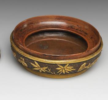 典型的 “扁圆形盖盒”,器形规整饱满,轮廓线条圆润流畅,符合晚明文房器物 “小巧精致、便于持握” 的审美。通常直径约 8-12 厘米,高 4-6 厘米,盖与器身以 “子母口” 严密扣合,闭合后浑然一体,无松动之感。以高纯度 “精铜” 为胎,铜质细腻致密,上手分量沉实(区别于同期粗制铜器的 “虚浮感”)。晚明江南铜器注重 “铜料甄选”,胡文明所制铜器尤重铜质,为后续鎏金与纹饰雕刻奠定基础。