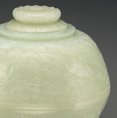 乾隆时期是中国封建社会的鼎盛阶段,经济繁荣,文化艺术高度发达。乾隆皇帝酷爱艺术,尤其对玉器情有独钟,他亲自参与了许多玉器的设计与鉴定工作,并设立了专门的玉作机构,为宫廷制作了大量的精美玉器。清乾隆刻花玉盖碗作为宫廷御用器物,不仅是实用器皿,更是身份与地位的象征,彰显了皇家的尊贵与威严。