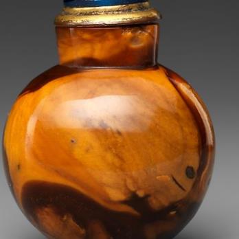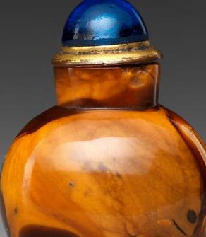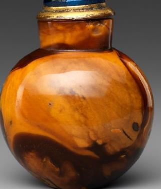 蜜蜡是一种有机矿物,体轻,性脆,不透明,其颜色多样,常见的有黄色、红色等,清代蜜蜡鼻烟壶多采用天然上乘的蜜蜡制作,质地温润如脂,入手有暖玉之感。圆形、椭圆形、方形、八角形等多种形状,常见的造型为扁圆形或椭圆形,腹部微微鼓起,也有一些呈扁平型,溜肩扁腹,直颈小口,造型古朴雅致。