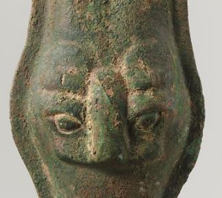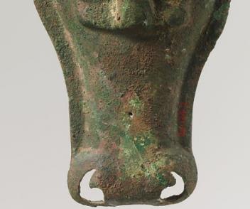 平面浅刻型:多装饰于兵器柄部、车马器表面,以线条勾勒兽面轮廓,纹样较简洁,更注重对称感,部分配件边缘会刻有弦纹、云雷纹作为辅助装饰,起到平衡构图的作用。
