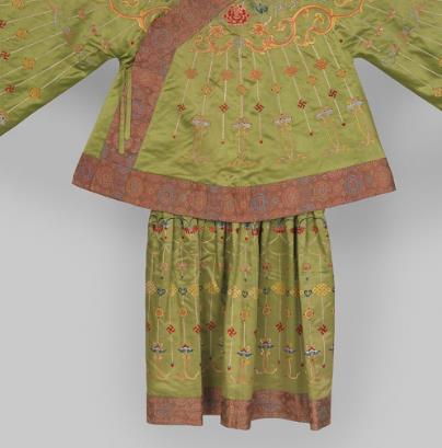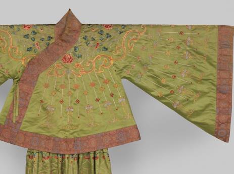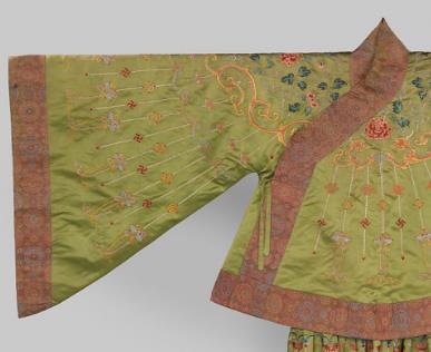 采用清代主流的高级缎织物,可能为库缎(清代宫廷专用缎,经纬密度高、质地厚重挺括)、织金缎(局部地子织入金线,增强华丽感)或素缎(如大红、明黄、石青等纯色缎,为彩绣提供鲜明底色)。清代缎料生产集中于江南(如苏州、杭州),宫廷用缎由 “江宁织造”“苏州织造” 专供,民间精品缎则用于富商或寺庙的高端服饰。