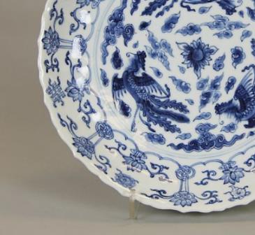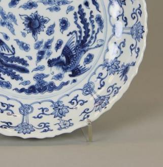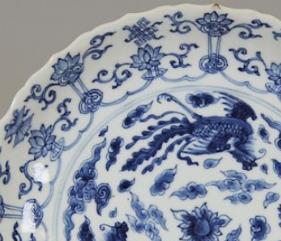 康熙时期是清代瓷器烧制的重要发展期,当时的制瓷工匠不仅掌握了制作青花器的精湛技术,还将我国传统的水墨画晕染法运用到瓷画中,使青花器清新明快,晶莹透澈。这一时期,官窑瓷器制作规整,民窑瓷器则绘工豪放,画意洒脱,青花三凤纹盘既体现了当时的制瓷工艺水平,也反映了人们对吉祥寓意的追求。
