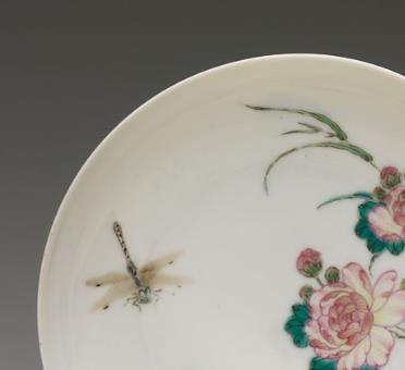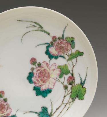 17 世纪末,一系列不透明釉上彩的创造是中国瓷器行业最重要的技术发展之一,这种盘上花朵的精致粉彩最早出现在 18 世纪初雍正皇帝统治时期,并在乾隆皇帝统治时期继续使用。