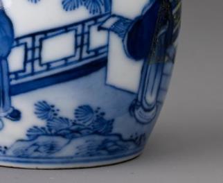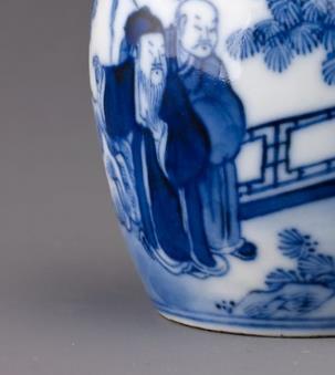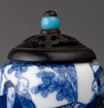 清康熙青花人物故事鸟食罐通常体量小巧(高度多在 5-10 厘米,口径 3-6 厘米),器型以 “收口、鼓腹、圈足” 为主,部分带盖或一侧设小流(便于喂食),整体造型圆润饱满,符合 “小器大作” 的康熙制瓷理念 —— 虽为喂鸟的实用器,却按精细陈设瓷的标准制作,细节处尽显匠心。