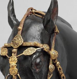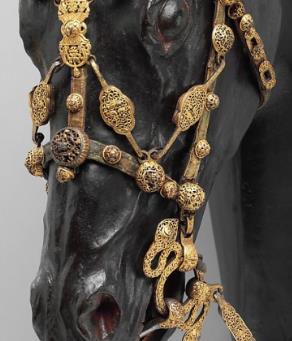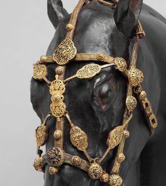 采用明代中原成熟的 “火法鎏金”(又称 “汞鎏金”)技术,流程包括:先将铁件表面打磨光滑并除锈,涂抹由金汞合金(金汞齐)与盐、矾等制成的 “金泥”,经炭火加热使汞蒸发,金层便牢固附着于铁表面。因西藏气候干燥,鎏金层保存完好度较高,现存实物多仍可见金箔的光泽,仅在边角磨损处露出铁胎的暗褐色,形成 “金铁相间” 的古朴质感。