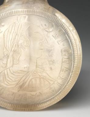 晶胎体纯净致密,无明显棉絮、裂纹(优质品),打磨后呈现 “玻璃光泽” 却更显温润,光照下可清晰透视壶内空间,凸显水晶材质的珍贵性 —— 清代水晶开采与加工难度大,优质水晶多为皇室、贵族所用,民间罕见。纹饰内容:完全模仿墨西哥 “鹰洋”(墨西哥独立后铸造的银币,正式名称为 “墨西哥共和国银币”)的正面图案
