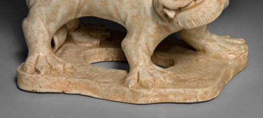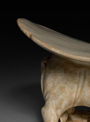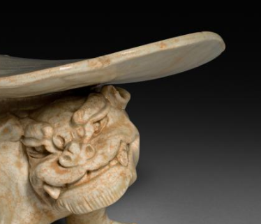 本品规格为12.5 x 15 厘米。以狮子为主体造型。狮子雕刻生动,五官神态威严,毛发等细节具古朴质感,身体敦实,四肢粗壮,呈现出力量感。上方弧形枕面线条流畅,整体施白釉,釉面有岁月沉淀的自然痕迹,融合实用与艺术,展现北宋瓷塑工艺,是研究当时生活与审美重要实物。