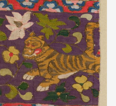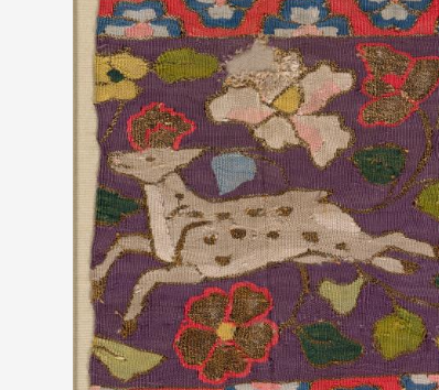 本品规格为58 x 27.2 厘米。以多彩丝线精心绣制。上段红底,绣有灵动的龙纹,龙身矫健,搭配花卉,尽显威严;中段与下段紫底,分别绣有鹿、虎等瑞兽,形态生动,穿插花卉、几何纹,色彩丰富和谐。针法细腻,将龙的气势、瑞兽的灵动与花卉的柔美完美融合,是北宋刺绣工艺与审美兼具的实物,见证当时织物装饰艺术的精湛 。