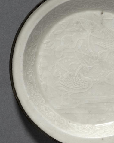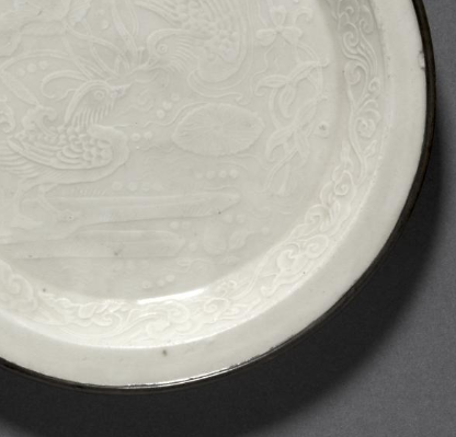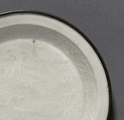 本品直径为14 厘米。为圆形,口沿镶金属扣(推测为后世保护或装饰)。通体施白釉,釉色温润。盘心以印花工艺呈现双禽(似鸳鸯等水禽)、花卉、水波等图案,构图精巧,线条清晰,边缘饰连续云纹,尽显定窑印花工艺精湛,是研究金代定窑陶瓷艺术与装饰风格的实物,体现当时对自然题材的喜爱与高超制瓷水平 。
