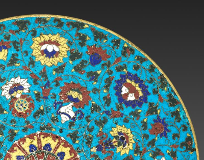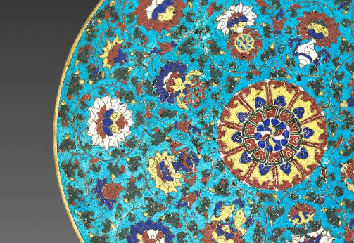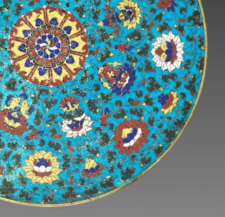 本品直径为30.8厘米。以蓝色珐琅釉为底色,尽显古朴典雅。盘心以掐丝工艺勾勒出圆形的缠枝莲纹,色彩丰富绚丽,红、黄、蓝、白等色相互映衬,线条细腻流畅。盘面分布着多组缠枝莲纹,花朵形态饱满,花瓣层次分明,枝叶缠绕自然,仿佛在盘中蔓延生长。边缘以金色勾勒,增添华贵之感,整体工艺精湛,将掐丝的精细与珐琅釉的明艳完美融合,展现明代掐丝珐琅高超技艺,是研究明代工艺美学的重要实物 。