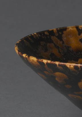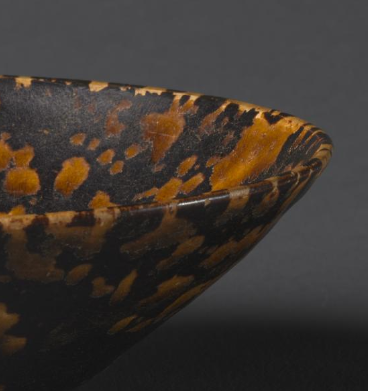 南宋时期,茶文化十分兴盛,斗茶之风虽较北宋有所减弱,但仍有一定影响力。 吉州窑玳瑁釉斗笠碗是非常适合饮茶的器具,尤其是用于点茶。其敞口的设计便于搅拌茶汤,使茶末与水充分混合,打出丰富的泡沫; 黑色与黄褐相间的釉面能清晰衬托出茶汤泡沫的颜色,方便人们观察斗茶时茶汤的色泽和泡沫持久度。此外,斗笠碗的造型符合人体工程学,持握方便, 深受茶人喜爱。